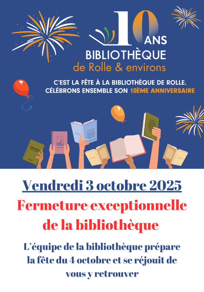 La bibliothèque sera exceptionnellement fermée le vendredi 3 octobre 2025. Toute l’équipe prépare la fête du 4 octobre et se réjouit de vous y retrouver.
